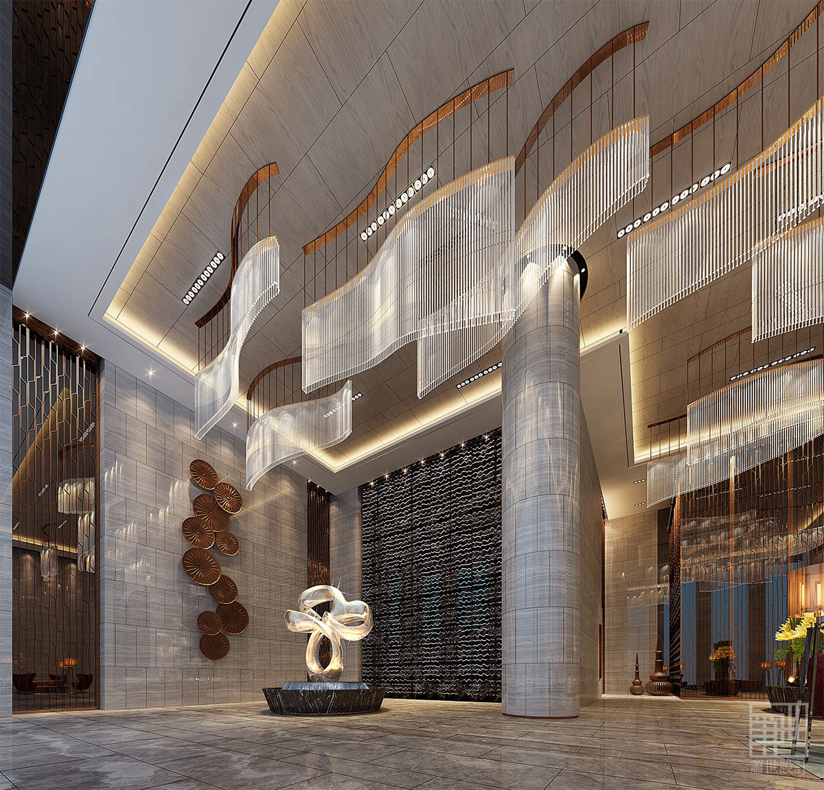 水清澈、通透、晶瑩,它是萬(wàn)物的生命之源 。水能生財(cái),湖能聚財(cái),這一傳統(tǒng)風(fēng)水理論,給本案帶來(lái)居多思想源泉。水可千變?nèi)f化,也可平如鏡面。設(shè)計(jì)師把波光粼粼、碧波漣漪、水波、水花等幾個(gè)水的常見(jiàn)形態(tài)用來(lái)作為設(shè)計(jì)元素的分形與提煉,把與水有關(guān)的形態(tài)語(yǔ)言巧妙的運(yùn)用到空間設(shè)計(jì)上。設(shè)計(jì)師從一開(kāi)始就注重了水的連貫性,首先從酒店主入口著手,采用圓形的噴泉作為過(guò)往車道的中軸景觀,再到大堂中心的水帶造型雕塑,使其作為酒店主要軸線。從外到內(nèi)以水為引導(dǎo)方式來(lái)聚齊八方客。