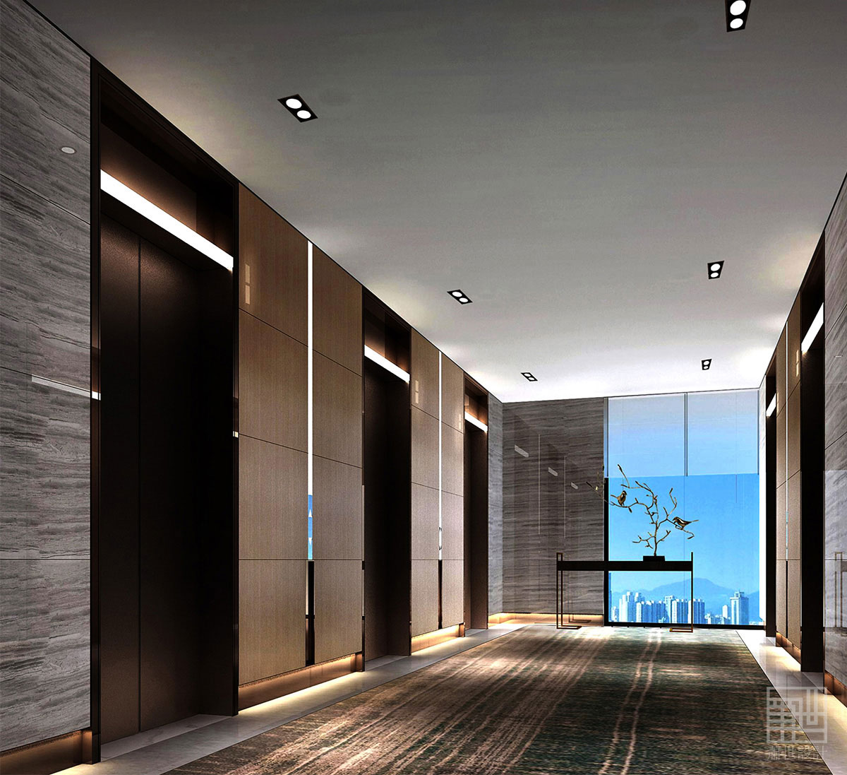由于一層電梯間空間無(wú)自然采光的弊端,設(shè)計(jì)師巧妙的運(yùn)用了以湖面景色的畫(huà)卷作為空間背景的延續(xù),把銅制的飛鳥(niǎo)作為端景雕塑構(gòu)建虛實(shí)變化來(lái)襯托空間的靈動(dòng)。同時(shí),客人在等候電梯時(shí),也能將其帶入這片美麗的湖色畫(huà)卷之中。
