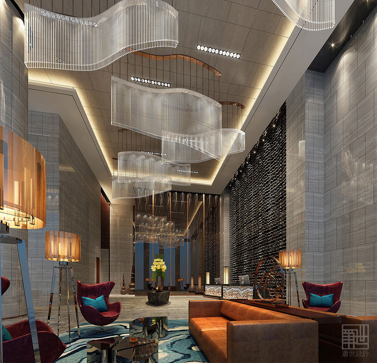 酒店大堂的空間本身方正且不規(guī)則,故沒(méi)有刻意去強(qiáng)調(diào)空間的對(duì)稱性,所以通過(guò)以“水”來(lái)以柔克剛來(lái)展現(xiàn)其自然柔和形態(tài),依次呼應(yīng)整個(gè)空間設(shè)計(jì)。在中國(guó)古代,九為陽(yáng)數(shù)的極數(shù),即單數(shù)最大的數(shù),借此大堂吊頂采用了九盞水波形態(tài)的水晶吊燈設(shè)計(jì),以九五之尊來(lái)闡釋對(duì)客戶尊貴。