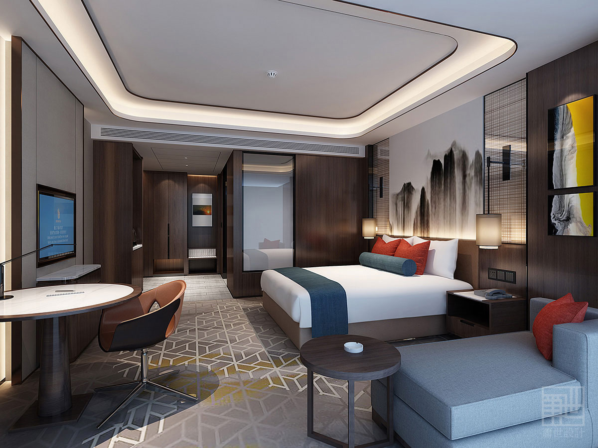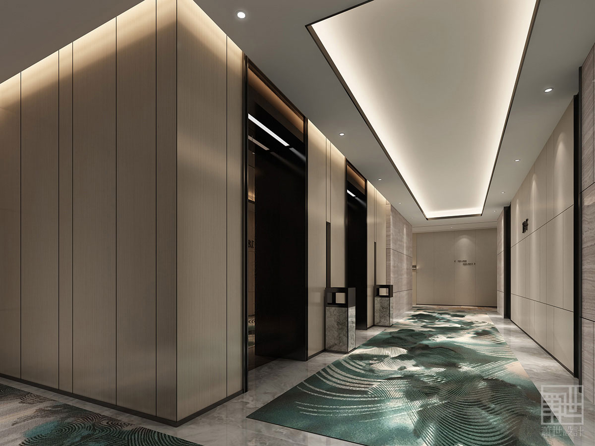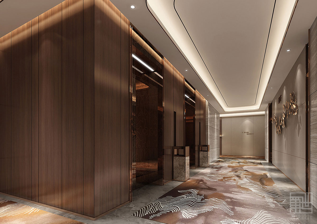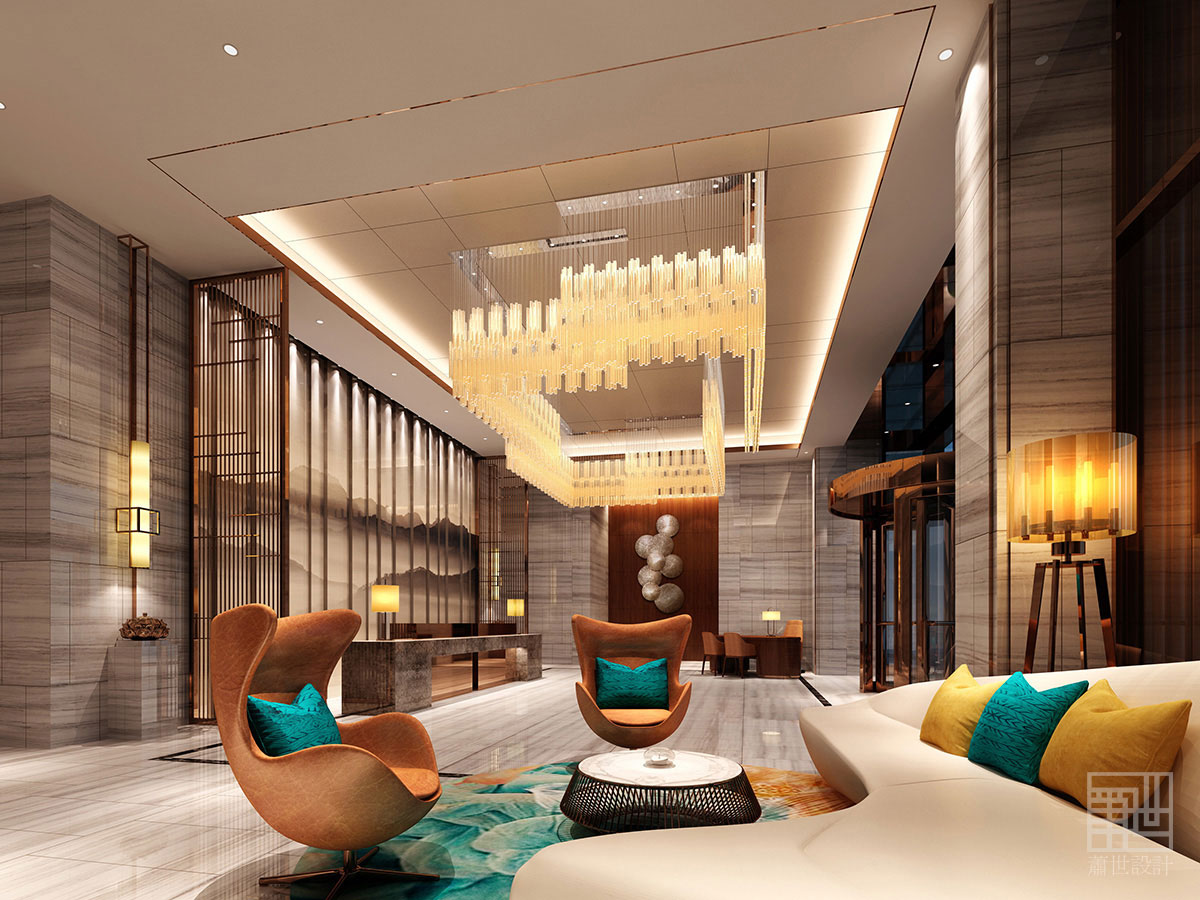 “湘中靈秀千秋水,天下英雄一郡多”,本項(xiàng)目位于湖湘文化祥地,偉人毛主席家鄉(xiāng)—湘潭,酒店主背景設(shè)計(jì)引用了畫家傅抱石《江山如此多嬌》。主席親筆為此畫題詞:“江山如此多嬌?!?畫面上旭日東升,江山壯麗,表現(xiàn)出新中國的勃勃生機(jī)。此造型抽象的呈現(xiàn)在酒店主背景,更加彰顯出湘潭人心憂天下之情懷,融匯中國傳統(tǒng)圖案元素的同時(shí),墻面采用水晶木紋石呈現(xiàn)了湘江之水暢流不息的蓬勃?dú)鈩?shì)。