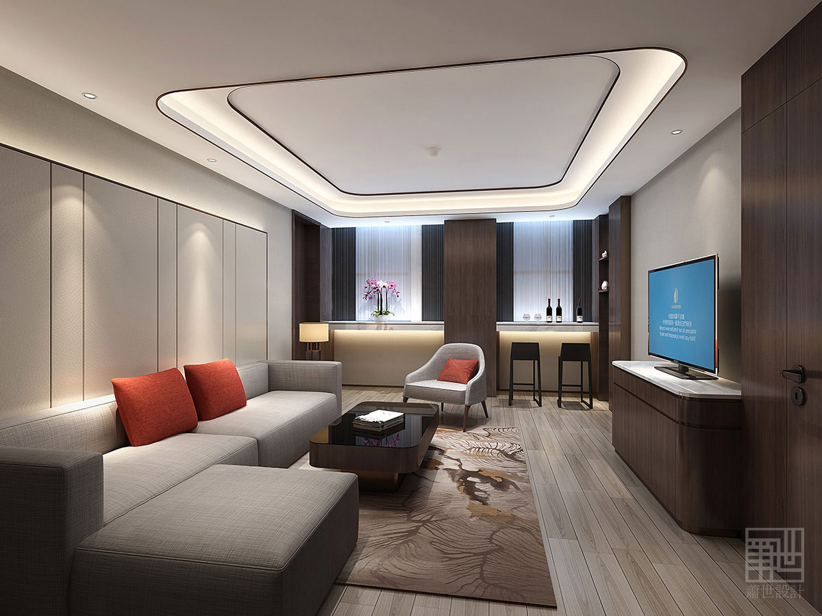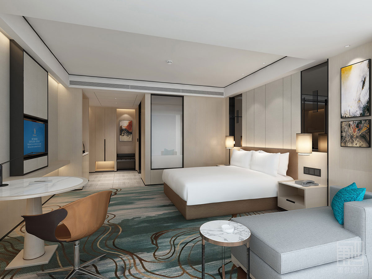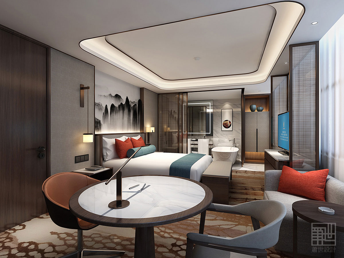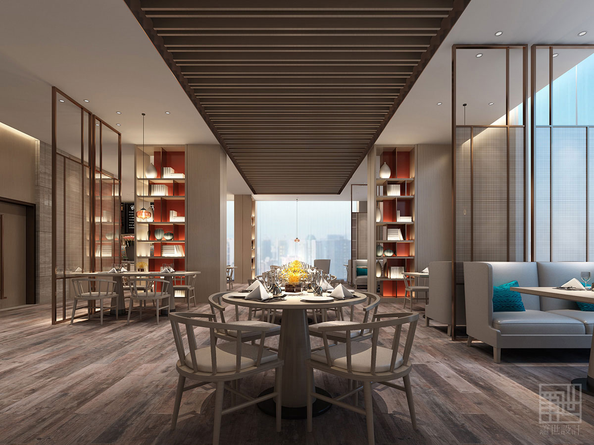 “湘中靈秀千秋水,天下英雄一郡多”,本項(xiàng)目位于湖湘文化祥地,偉人毛主席家鄉(xiāng)—湘潭,酒店主背景設(shè)計(jì)引用了畫家傅抱石《江山如此多嬌》。主席親筆為此畫題詞:“江山如此多嬌?!?畫面上旭日東升,江山壯麗,表現(xiàn)出新中國的勃勃生機(jī)。此造型抽象的呈現(xiàn)在酒店主背景,更加彰顯出湘潭人心憂天下之情懷,融匯中國傳統(tǒng)圖案元素的同時(shí),墻面采用水晶木紋石呈現(xiàn)了湘江之水暢流不息的蓬勃?dú)鈩?shì)。