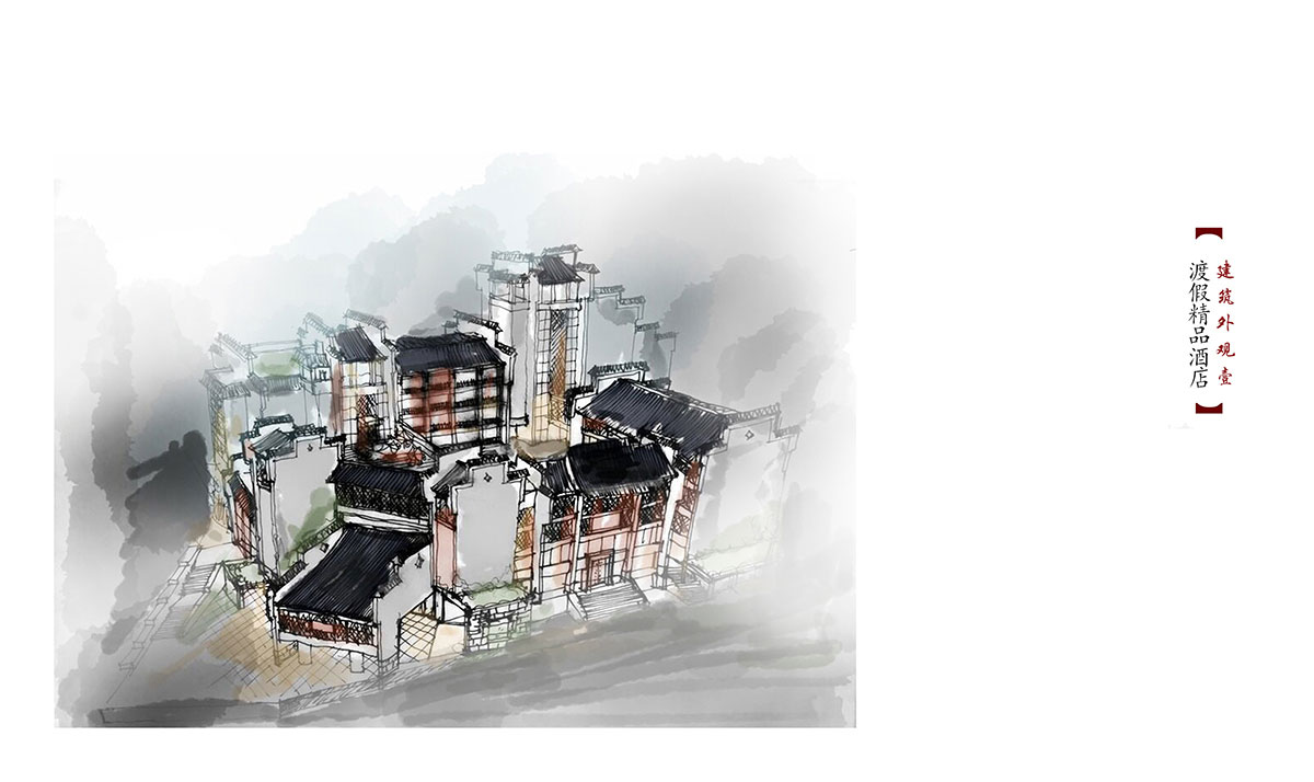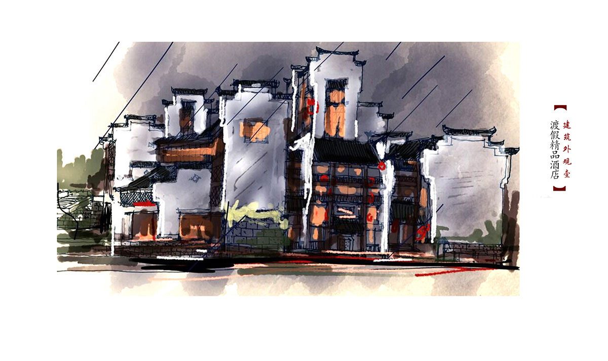「天心·城市精品酒店」的整體風(fēng)格為帶有徽派建筑色彩的現(xiàn)代建筑,而徽派的建筑語(yǔ)言與現(xiàn)代酒店建筑尺度之間的矛盾便成為這次設(shè)計(jì)任務(wù)中最主要的考量。