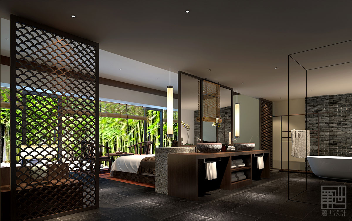 通過(guò)空間的收與放、圍與合像蘇州園林中的先抑后揚(yáng)的手法運(yùn)用在空間形態(tài)中。并且融合現(xiàn)代生活的設(shè)計(jì)觀念:以四個(gè)字來(lái)貫穿整體空間 - 清、雅、樸、華。